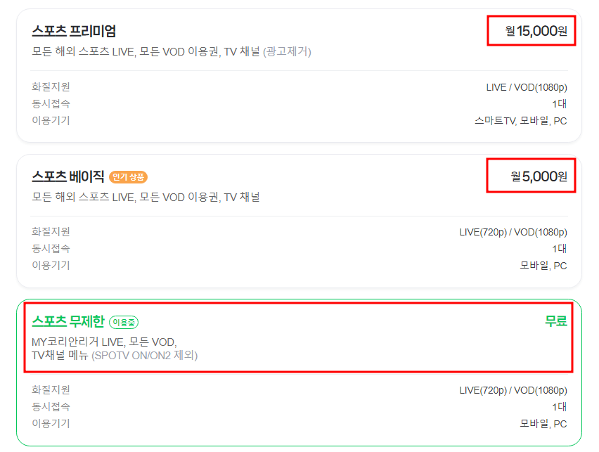 - 모바일 / pc, 고화질, 모든 경기 LIVE, VOD => 가격 PC 월 9,900원, 모바일 12,000원