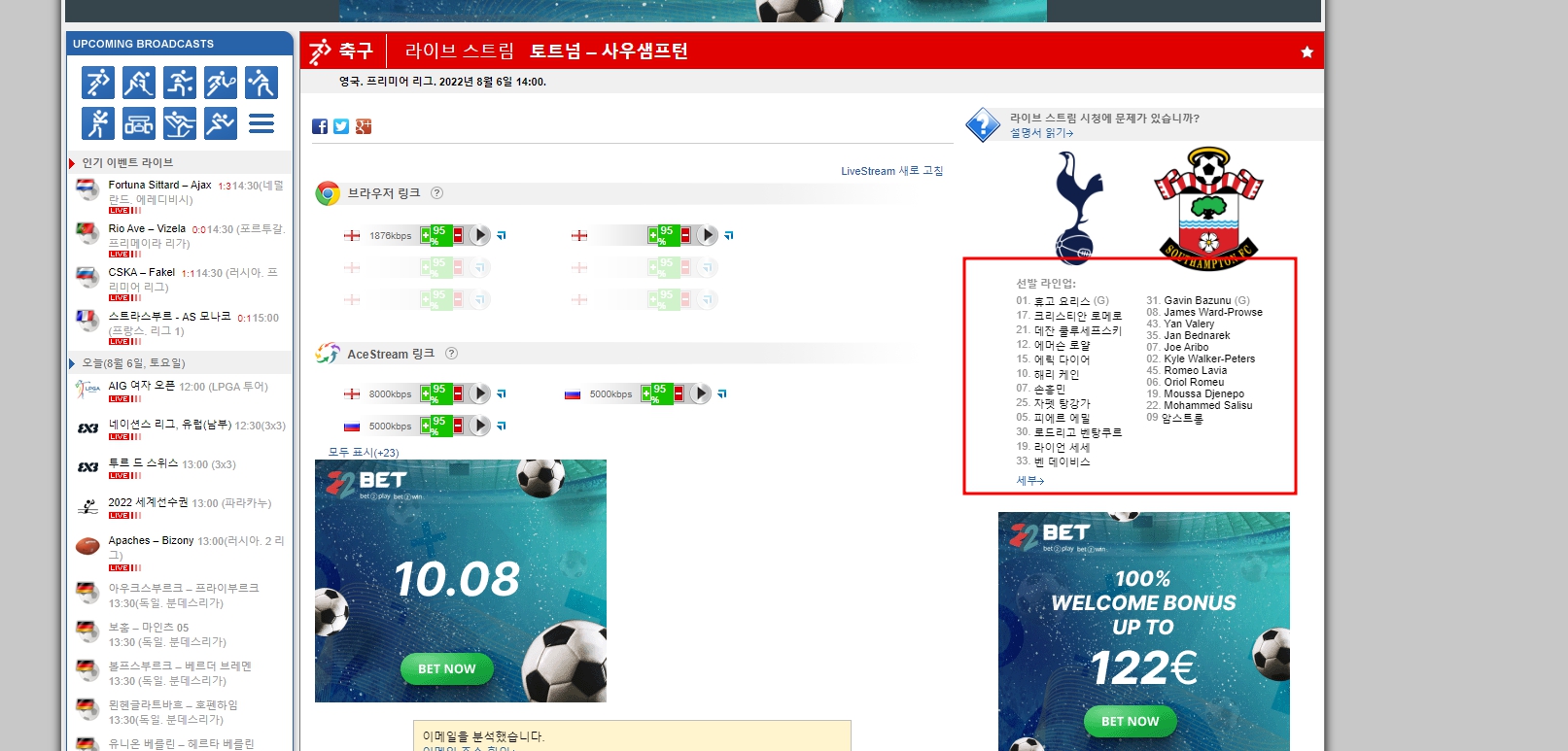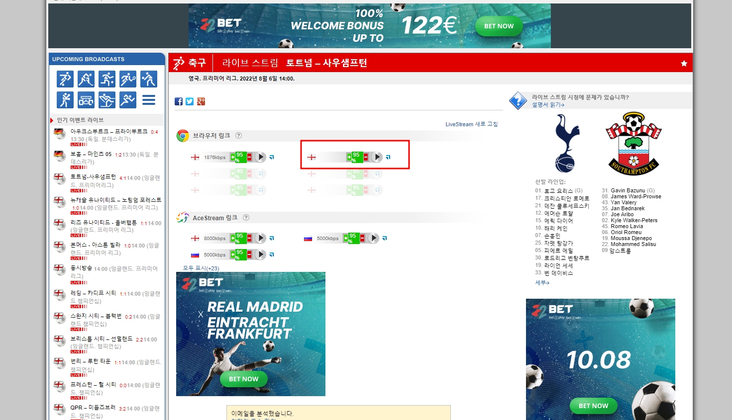 2. 그다음 위에 그림기준(22-23개막전인 토트넘 사우샘프턴 중계)으로 브라우저 링크와 AceSteram링크 가 있는데요, 이 중에서 가능하면 브라우저 링크로 보시는 게 편합니다. 브라우저 링크로 보시면 그냥 웹브라우저에서 이 아래 있는 화면처럼 실시간 중계화면이 나오게 됩니다.