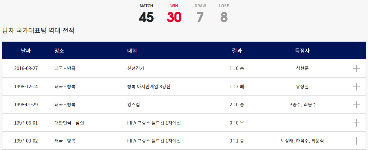 이번 2024년 03월 21일 대한민국 태국 경기 성인 기준으로 A매치 대결은 무려 45번이며 이중 승리가 30번 그외 7번의 무승부 패배는 8번이 있습니다. 다만 역대 전적이 의미가 크게 없어보이는건 두 팀의 마지막 대결이 2016년에 있긴 했지만 이때역시 1998년 경기이후 18년만에 펼쳐진 경기였습니다. 현재 기준 정말 많은 차이가 나는 대한민국과 태국의 축구 실력 차이가 있습니다. 피파랭킹이 우리가 훨씬 앞서고 있으며 현재 기준 실력은 우리나라와 비교가 안된다고 보고 있습니다.